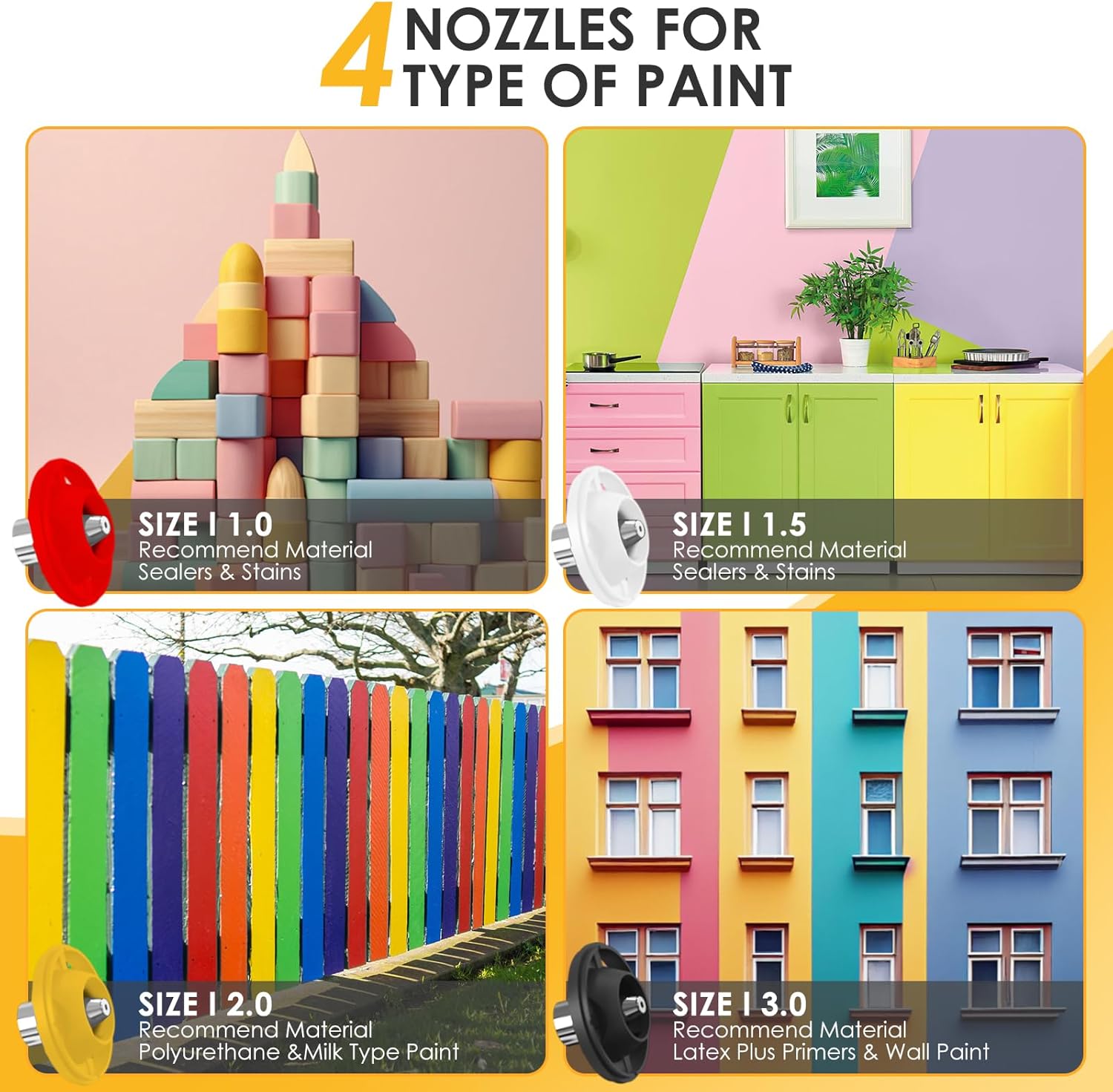 This electric spray paint machine comes with 4 nozzles, measuring 3.0 mm, 2.0 mm, 1.5 mm, and 1.0 mm.Easily switch between different spray modes to accommodate various materials and surfaces,ensuring optimal coverage and finish with every use.Made of pure copper, these nozzles not only prevent paint corrosion but also extend the lifespan of the spray machine.