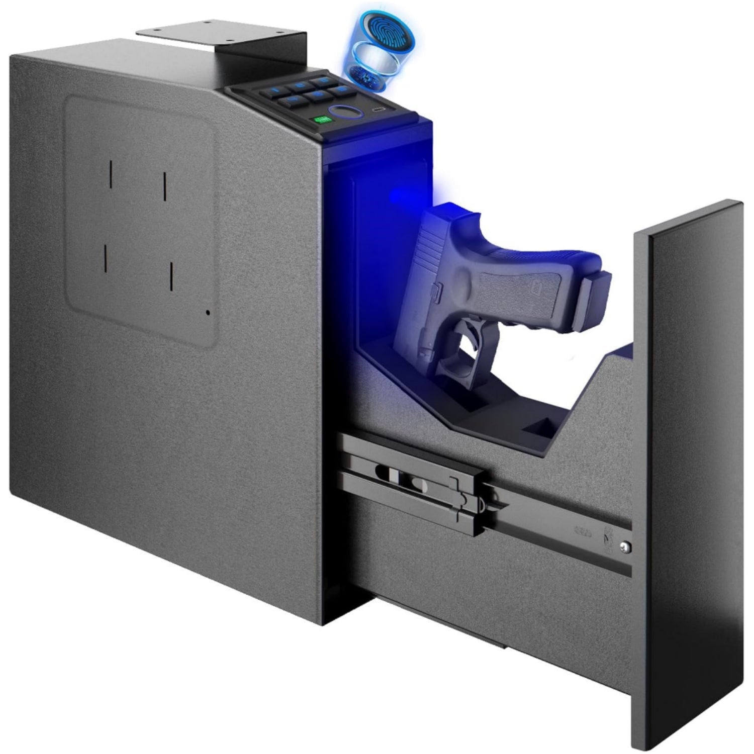 This pistol safe accommodates handguns up to 9.5 inches in length, along with one spare magazine. Its slim, vertical design makes it ideal as a biometric gun safe for handguns for mounting under desks, beside nightstands, or discreetly on the floor. The versatile mounting plate allows for installation on walls, floors, or shelves, making it a great nightstand gun safe.